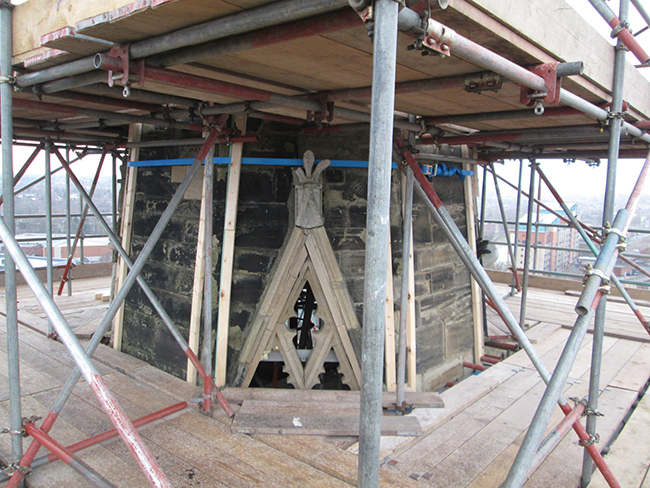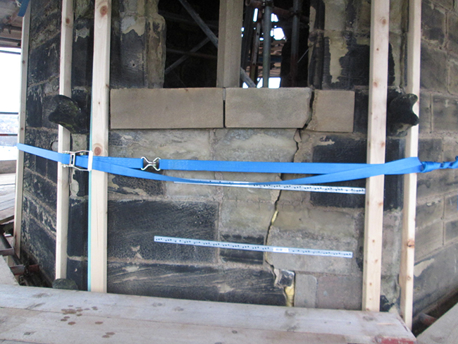 The spire, over 35m tall sat atop the 30m high tower (note the past tense!). Likely to date back to the C18 alterations, an assessment of the tower showed it suffered from many defects, including fundamentally a weak sandstone, severe weathering, ovaling, lack of bonding, and extensive vertical fissures running to 6 to 8 meters in length.