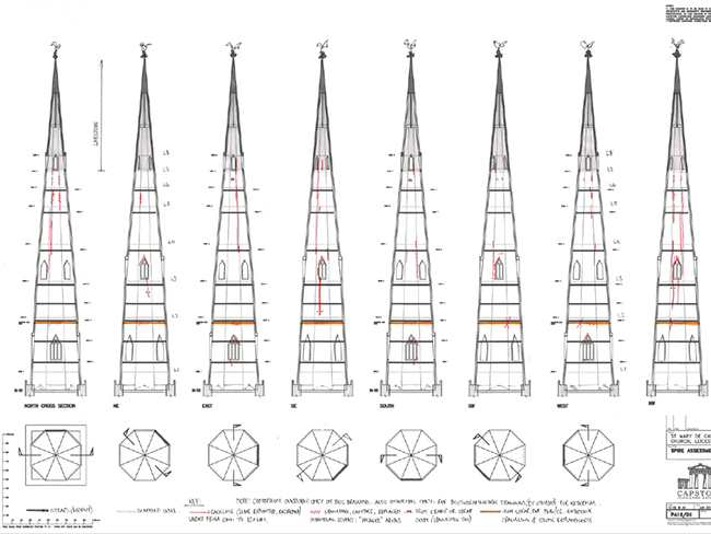 My assessment concluded that the spire had a 'factor of safety' of one to withstand the typical wind loading imposed upon it. In other words it was dangerously close to collapse. Various repair options were considered in detail, including the introduction of an inner skin of brickwork, but working in partnership with the church architect and English Heritage, these were all discounted due to the severity of the accumulative effect of all the defects. The radical conclusion of my assessment work was: dismantle the spire.