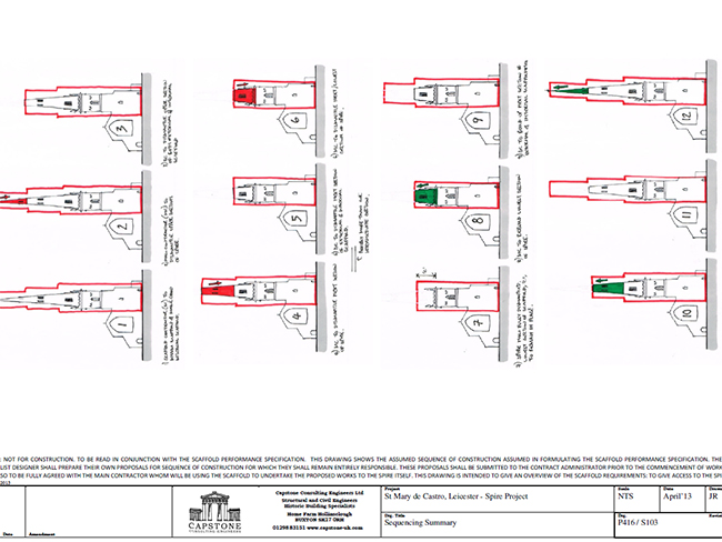Capstone prepared a carefully thought through 'performance specification' for the design of the scaffold, and the sequencing for its erection and dismantling. The heightened risk of collapse due to the presence of the scaffold was spelt out to all parties involved, including Building Control, the main contractor, the client, the scaffold designer, EH (the funder) and church architect. Capstone proposed risk mitigation measures, including vane anemometer wind speed readings, and daily tailored forecasts from the Met Office. Sharing the risk, all parties agreed to proceed. The scaffold was erected over a 7 week period and the spire was successfully dismantled in early 2014.