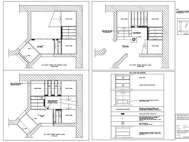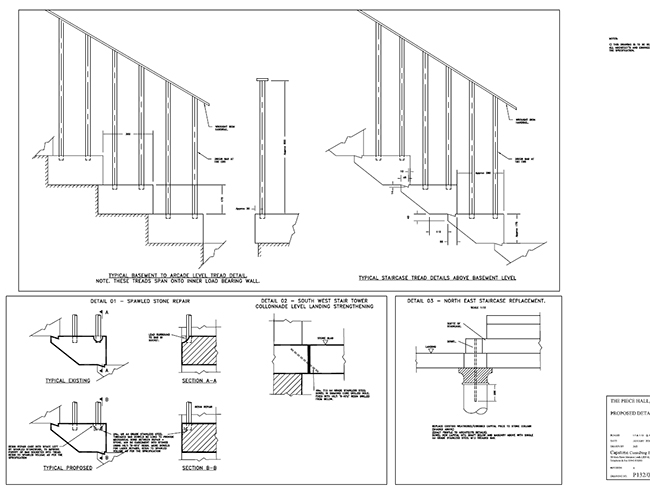 Following a detailed analysis and assessment of repair options, the decision was made to replace individual treads with new where necessary. Capstone devised a sequence of operations and temporary support to allow this to be done, carefully ensuring the remaining stair was supported until the new tread was inserted, and the mortared abutting joints had gained strength.