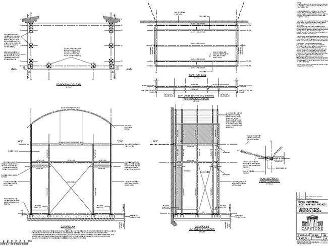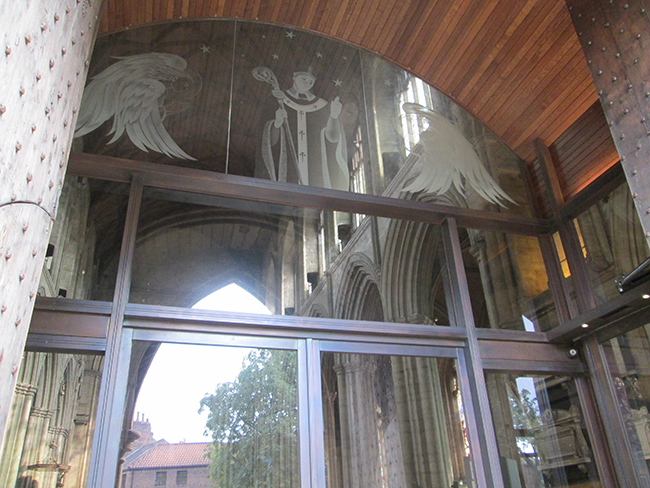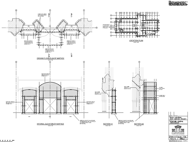 With the needs of conservation ever to the fore, I designed shallow foundation slabs for the structures, that could be easily adapted on site should archaeological material be encountered (a technique I had previously used at Kirskstall Abbey). Also, despite the need to cater for significant wind pressures (with the outer doors open, inner doors shut), I reduced the fixings into the masonry down to only a pair per structure. Should the narthex structures ever be replaced, these fixings are detailed so that they can be reused with any replacement.