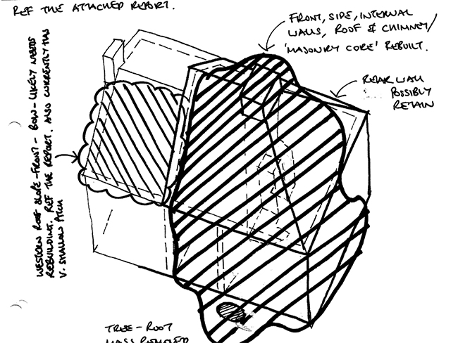 I spent around 3 hours inspecting this structure. I find that you really need to spend a significant amount of time fundamentally looking at a building to fully understand it. I sketched up the structure, and gained an overview picture of the defects, how they related to each other, and their causes.